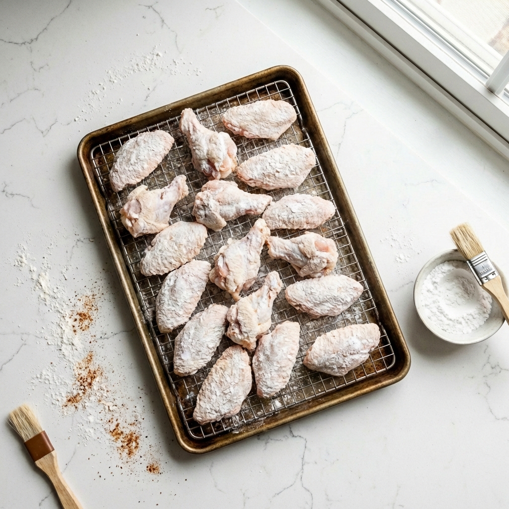 Arrange the wings in a single layer on a wire rack set over a baking sheet. Refrigerate, uncovered, for at least 4 hours, or ideally overnight. This drying step is non-negotiable for crispness.