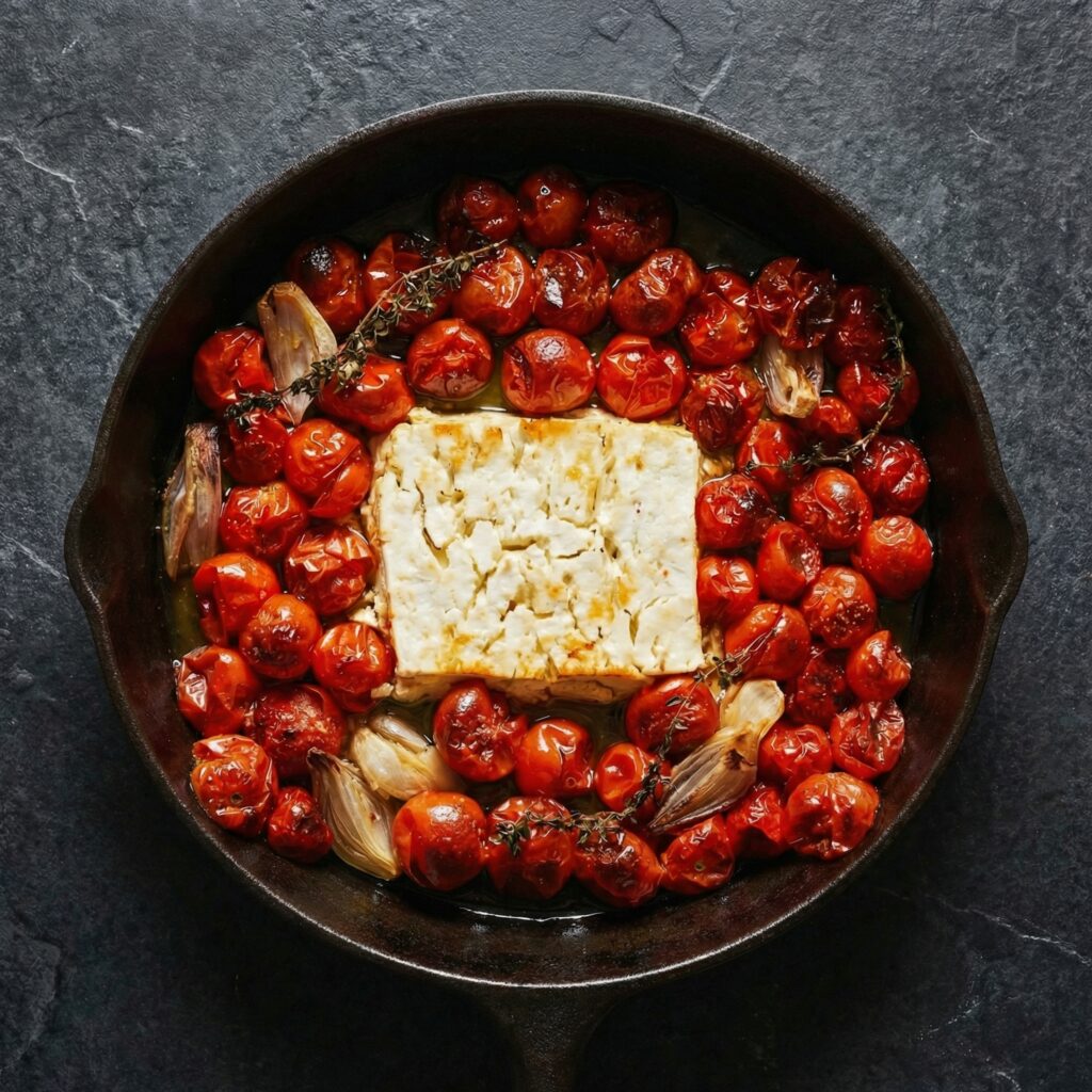 This setup allows the tomatoes to blister and burst while the feta softens into creamy perfection.