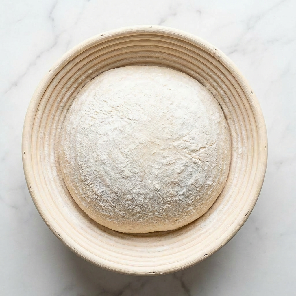 Gently turn the dough out onto a lightly floured surface. Using a bench scraper, shape it into a tight ball (a “boule”) by folding the edges into the center and rotating. Let it rest seam-side down for 20 minutes (bench rest). For the final shape, flip the dough over (seam-side up), create surface tension by pulling the dough toward you, then place it seam-side up into a well-floured proofing basket (banneton).