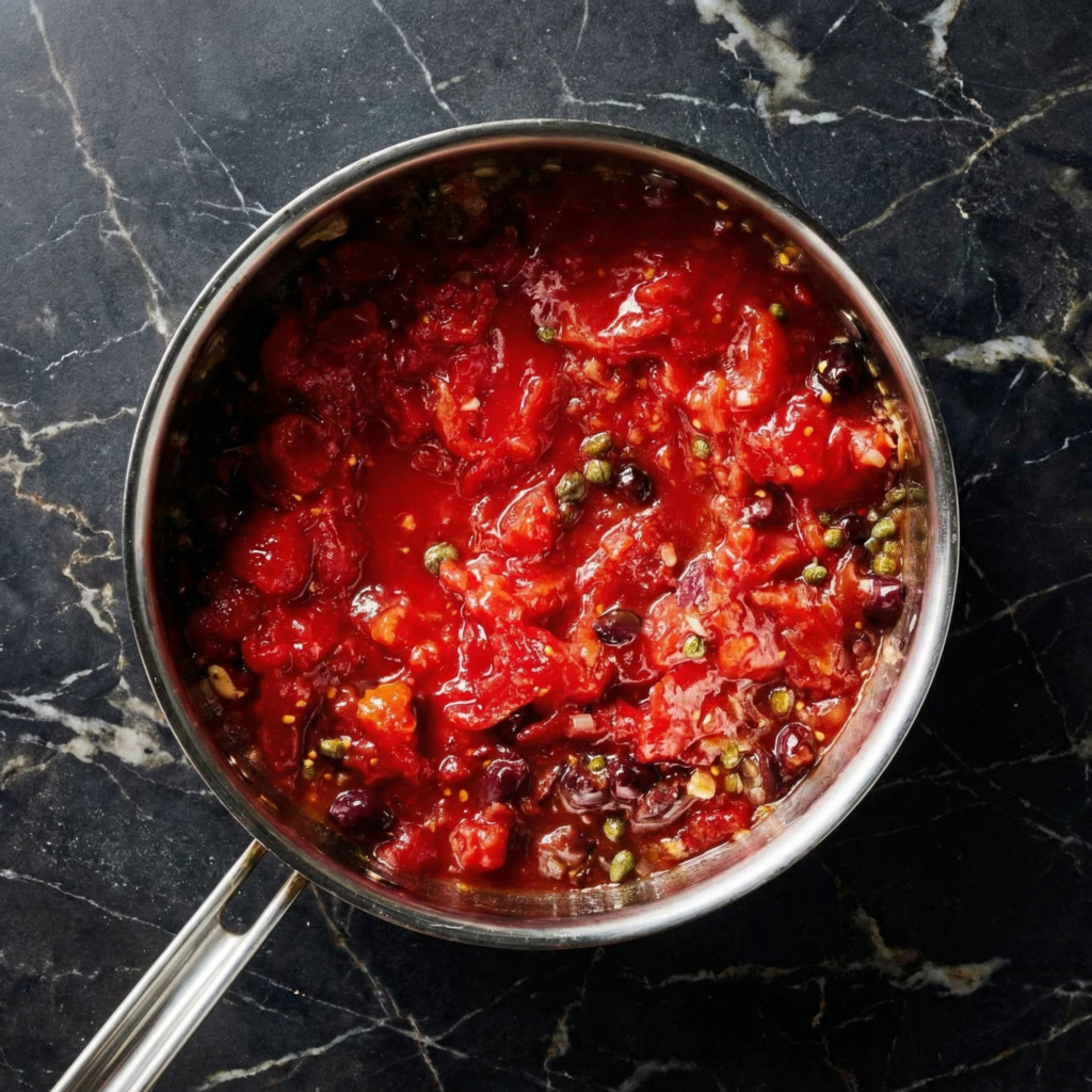 Simmer for 6–8 minutes, stirring occasionally, until the sauce thickens slightly and flavors meld. Taste and adjust seasoning—anchovies add saltiness, but you may want a pinch of extra salt depending on your preference.