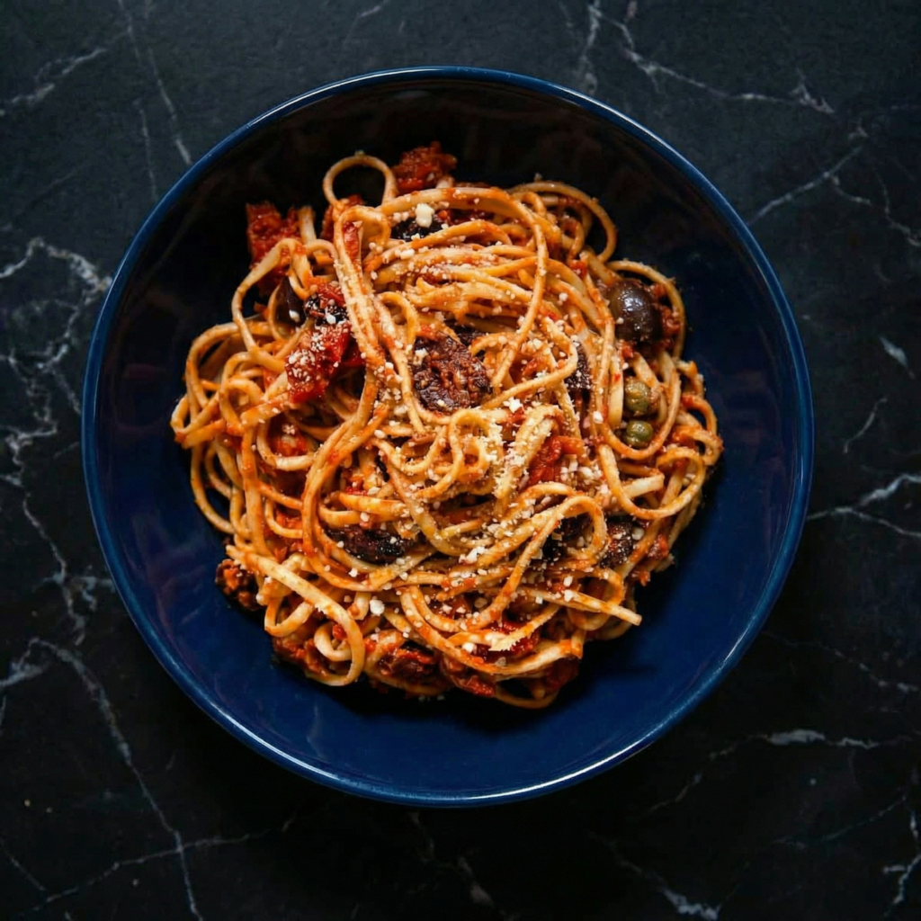 The magic of Pasta Puttanesca is in its sauce: briny olives, tangy capers, and salty anchovies blend with aromatic garlic and chili flakes to create a sauce that clings beautifully to every strand of pasta.