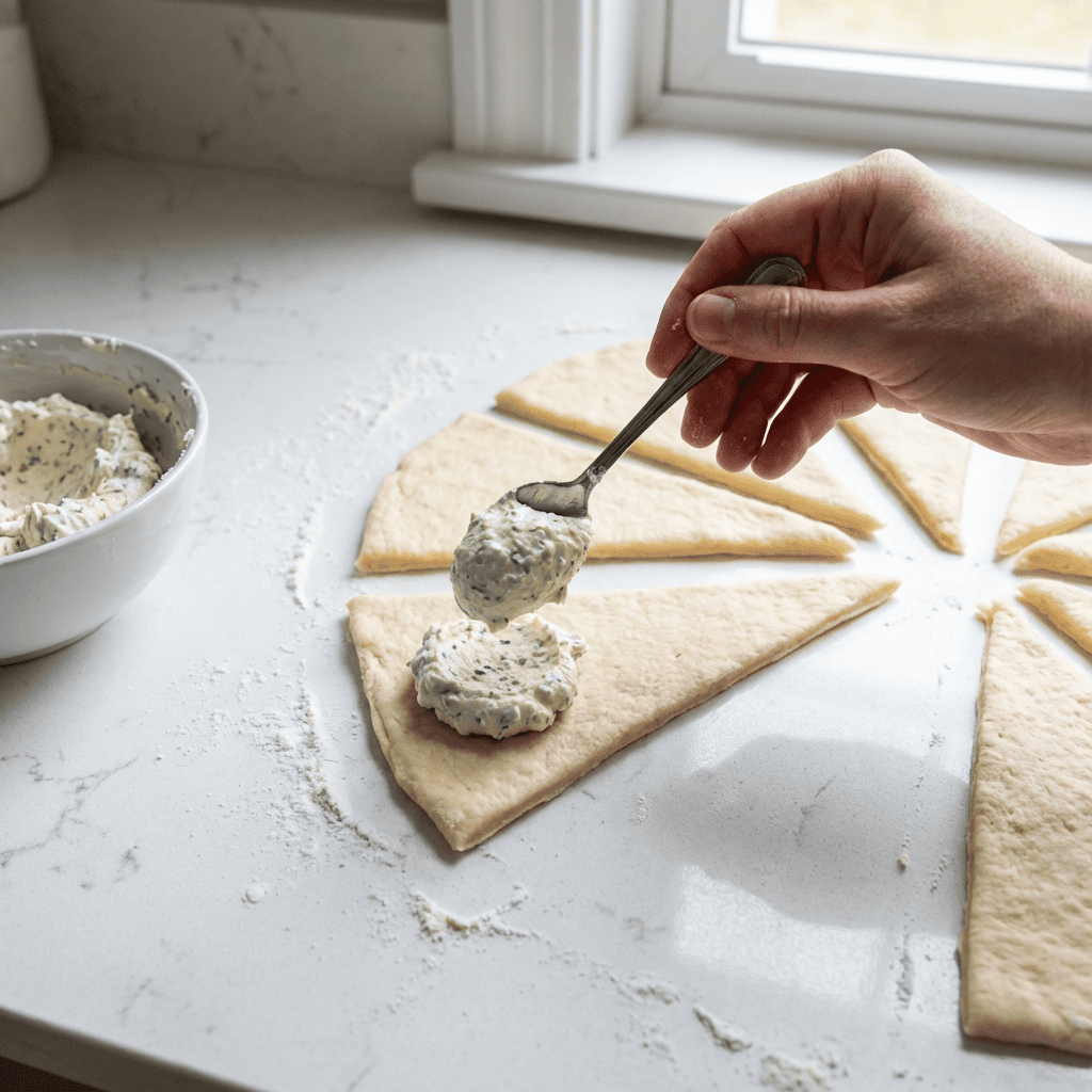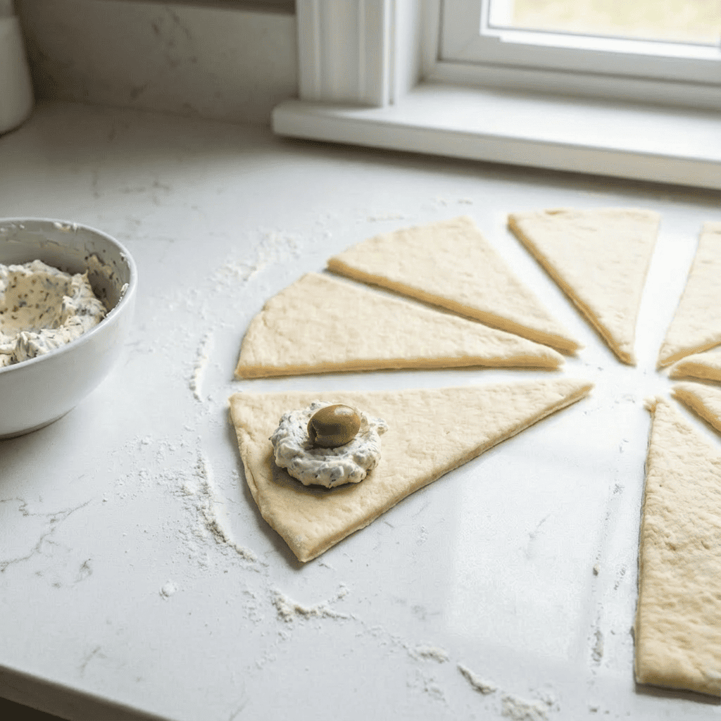 Place about 1 teaspoon of the cream cheese mixture onto the wide end of each dough triangle. Place one drained olive on top of the cheese. Gently roll the dough triangle up from the wide end, wrapping it around the olive and cheese completely. Pinch the seams and ends to seal tightly. Ensure the olive is fully enclosed.