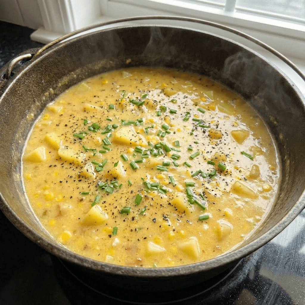 This Cheesy Potato and Corn Chowder is the ultimate comfort food in a bowl – creamy, hearty, and packed with flavor. Tender potatoes and sweet corn swim in a rich, velvety cheese broth, finished with crispy bacon and fresh chives. It’s a simple, one-pot wonder that’s perfect for cozy nights and will have everyone asking for seconds!