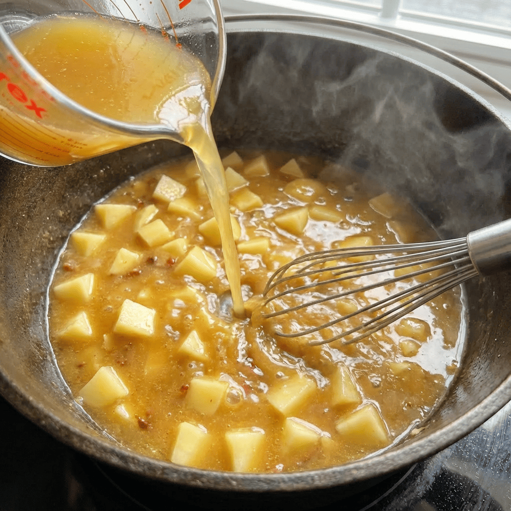 Step 3: Simmer the Potatoes. Gradually whisk in the chicken broth, ensuring no lumps remain. Add the diced potatoes, thyme, salt, and pepper. Bring to a boil, then reduce heat to a simmer. Cook, uncovered, for 15-20 minutes, or until the potatoes are very tender.