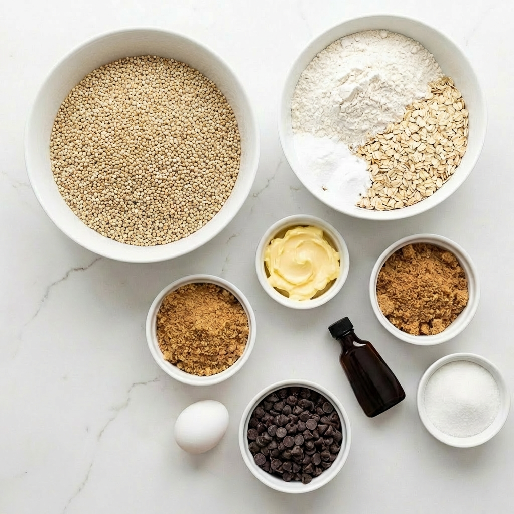 Using a combination of oats and all-purpose flour provides structure while maintaining a hearty, whole-grain feel. The high ratio of brown sugar adds moisture and caramel notes, enhancing the quinoa’s nuttiness.