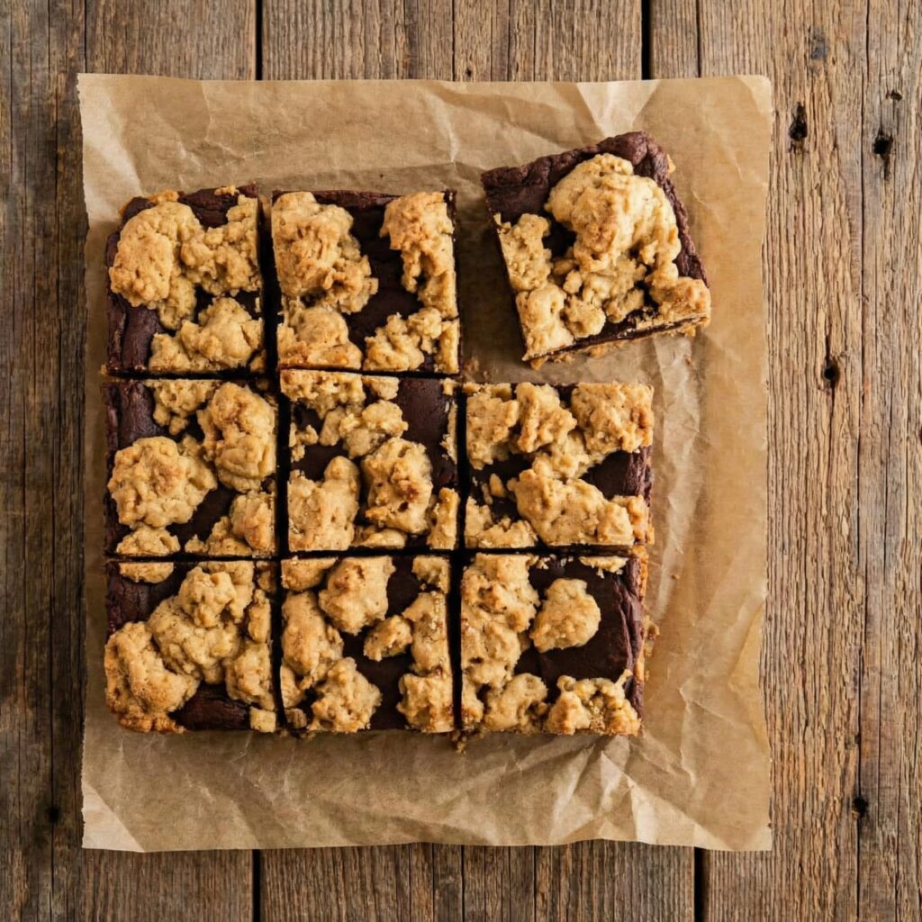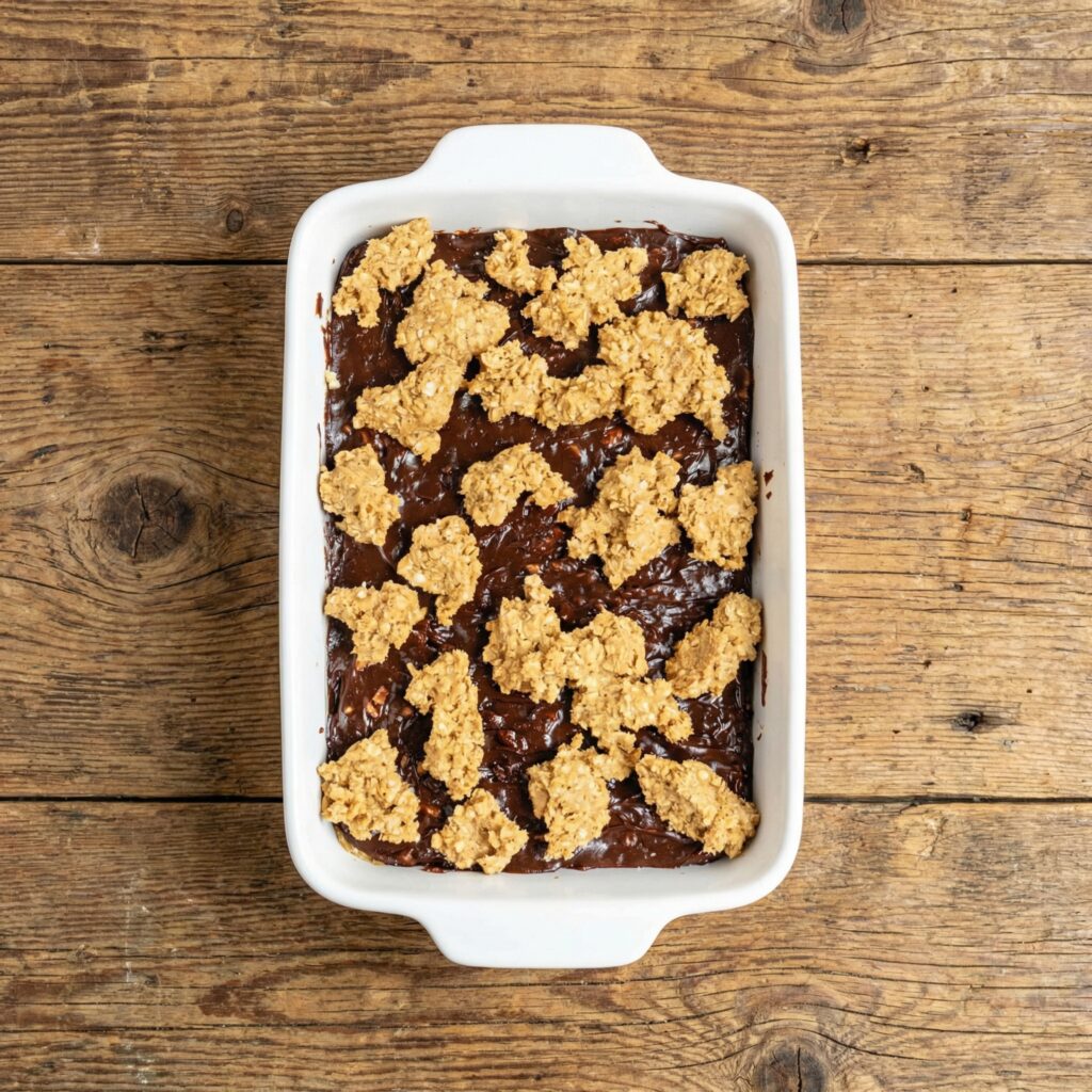Crumble the remaining oatmeal dough evenly over the chocolate layer. Don’t worry about covering every inch—the chocolate peeking through creates that classic rustic look.