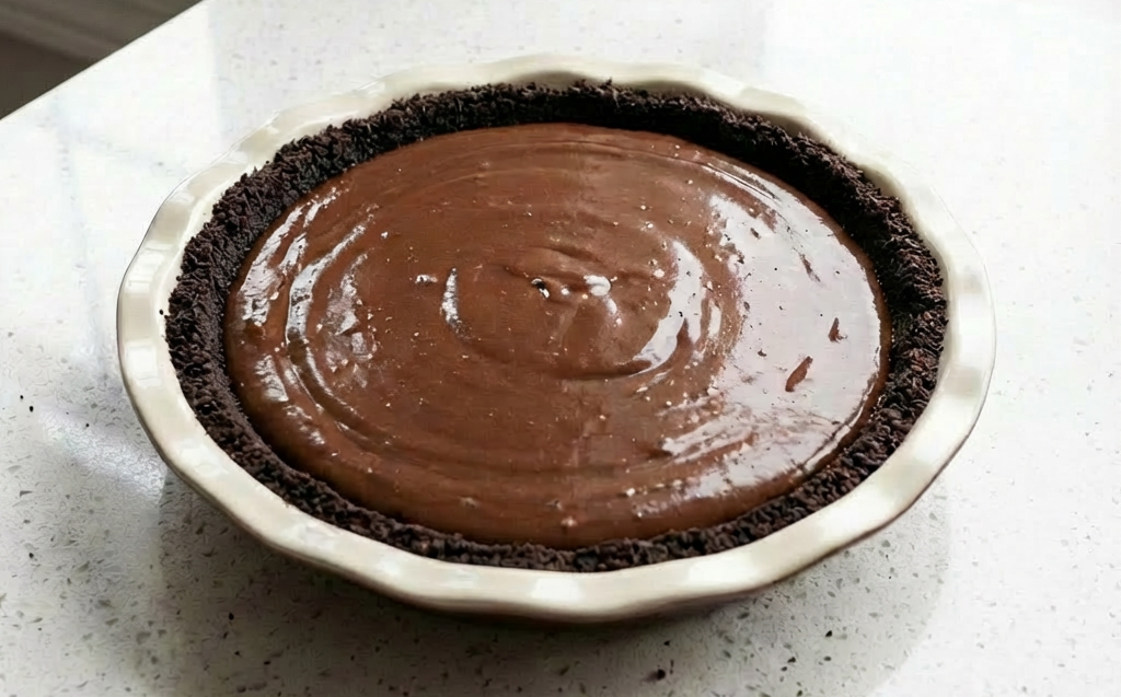 The star is the pudding—a luxurious, from-scratch chocolate custard cooked on the stovetop until it’s thick enough to coat a spoon. Poured into the waiting crust and chilled, it sets into a sliceable, intensely chocolatey filling that’s far superior to any mix.