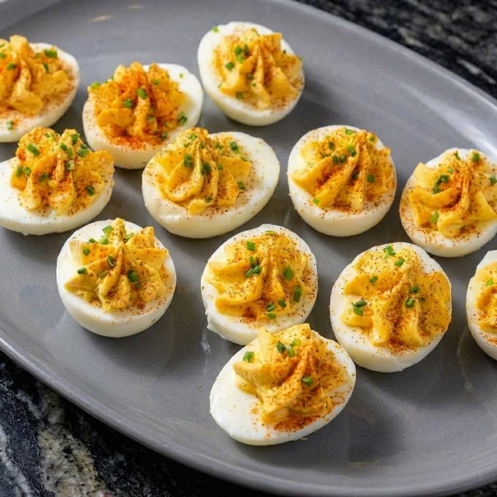 Topped with a sprinkle of paprika, they’re as beautiful as they are delicious. While simple, the technique matters: perfectly boiled eggs, a smooth filling, and careful piping make all the difference. Once you master these, you’ll be asked to bring them to every gathering.
