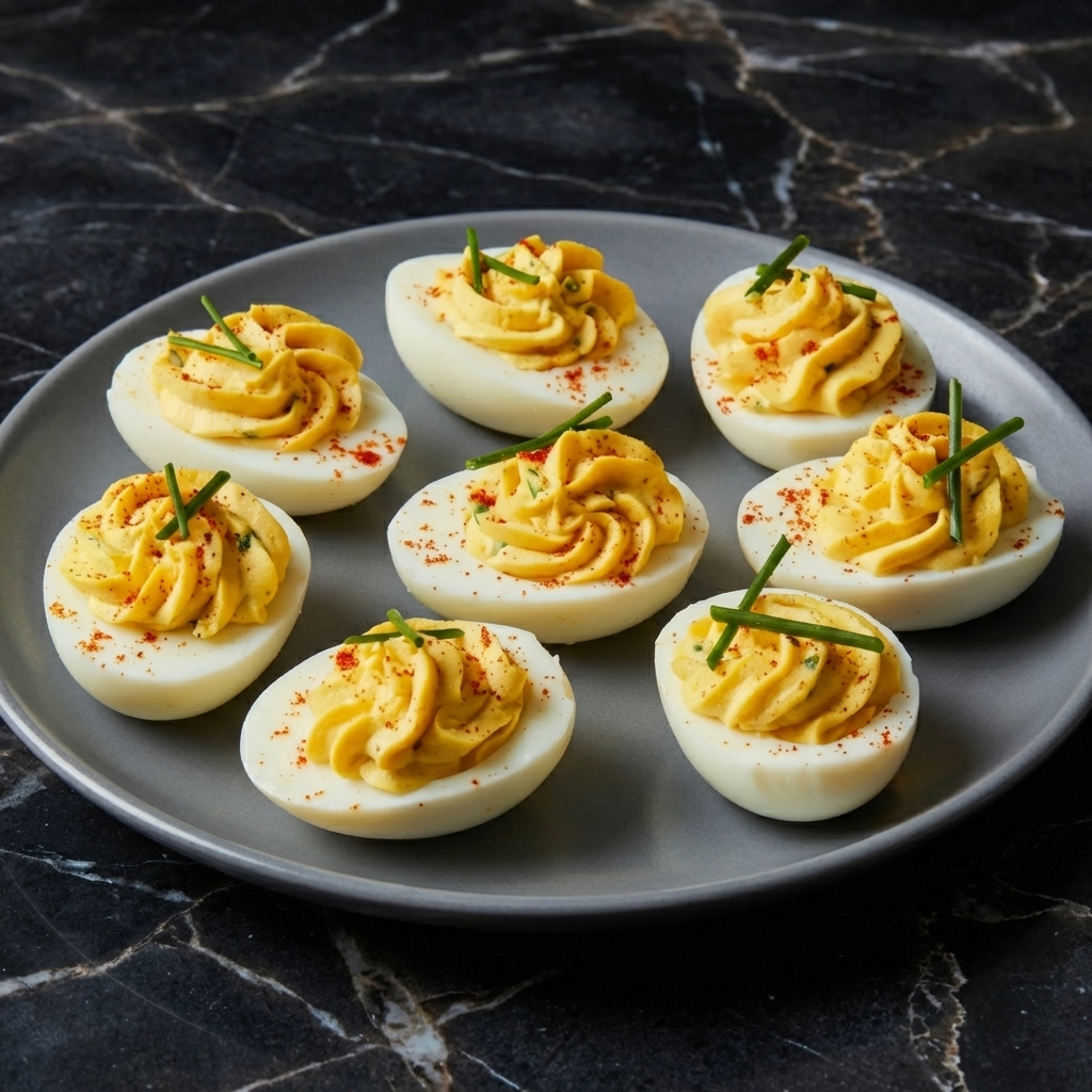 Topped with a sprinkle of paprika, they’re as beautiful as they are delicious. While simple, the technique matters: perfectly boiled eggs, a smooth filling, and careful piping make all the difference. Once you master these, you’ll be asked to bring them to every gathering.