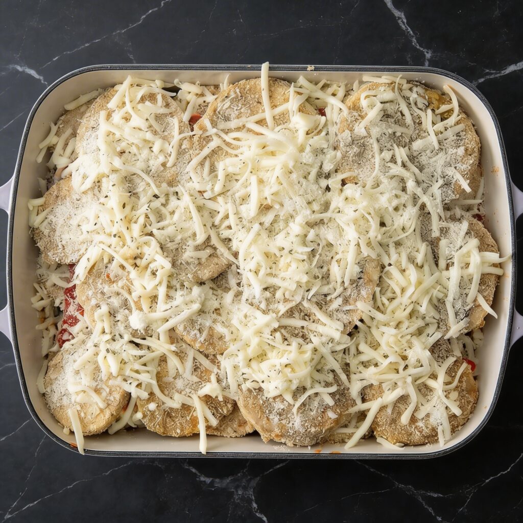 Preheat your oven to 375°F (190°C). Spread a thin layer of tomato sauce on the bottom of a 9×13-inch baking dish. Arrange a layer of fried eggplant slices over the sauce.