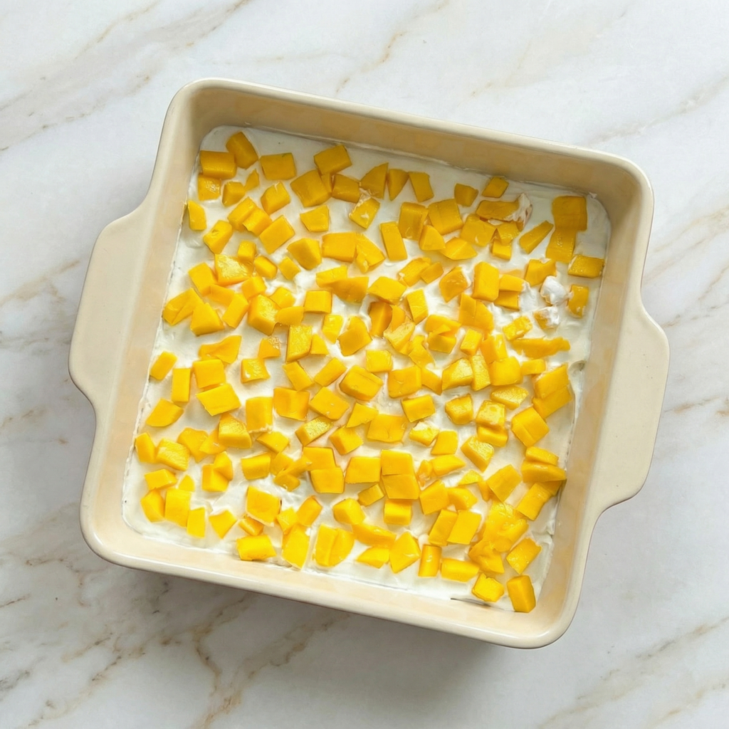 Don’t overcrowd the mangoes—just enough for a balanced layer.