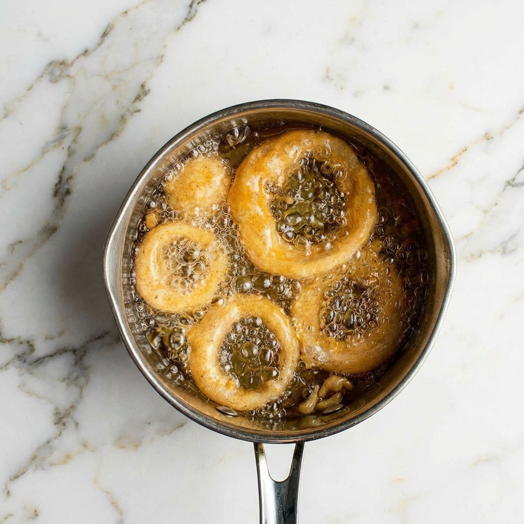 Carefully lower the battered rings into the hot oil. Do not crowd the pot. Fry for 2-4 minutes, turning occasionally with a spider or tongs, until they are a deep, uniform golden brown and very crisp.