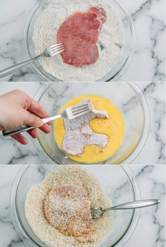 Dredge each pork cutlet in flour, shaking off excess. Dip into the eggs, then coat thoroughly in breadcrumbs. Press gently so the crumbs stick.