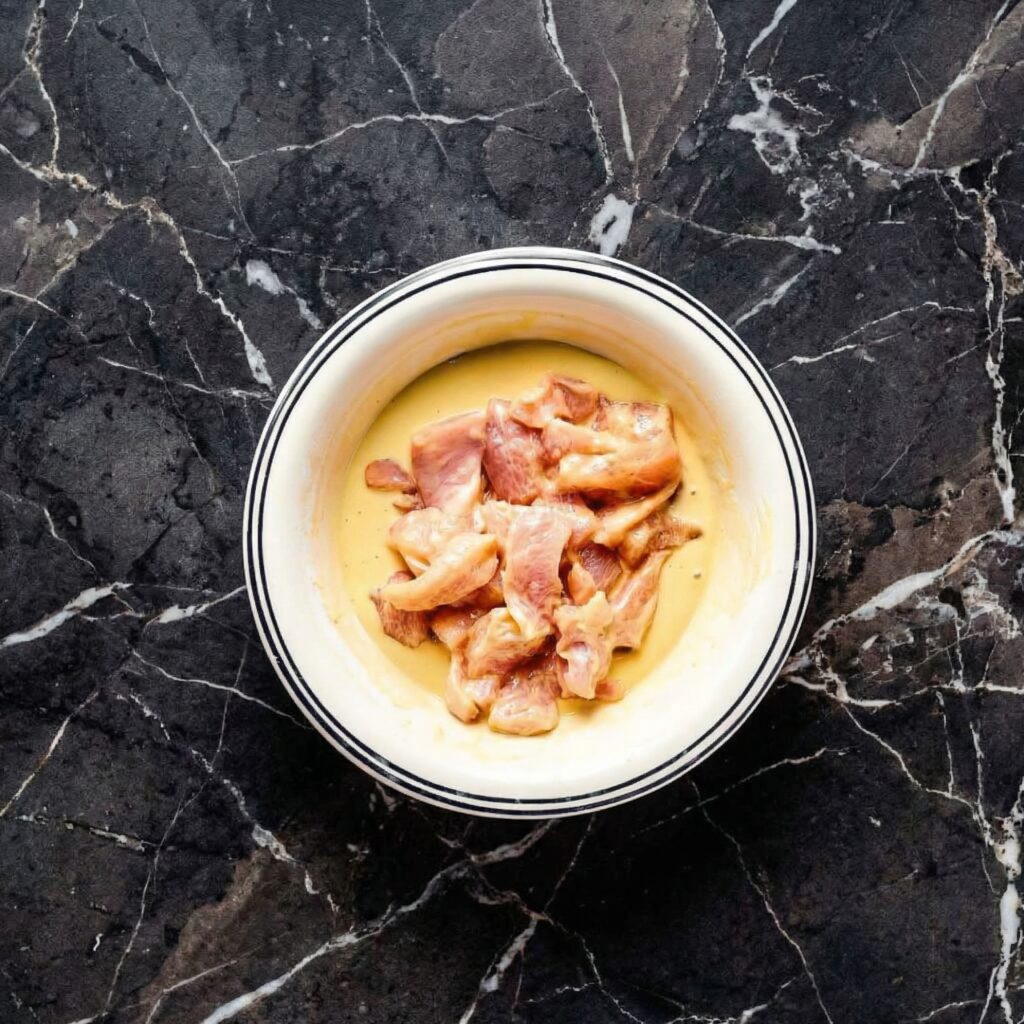 Dip each piece of chicken into the egg, then coat thoroughly in cornstarch. Press gently so the coating sticks well.
