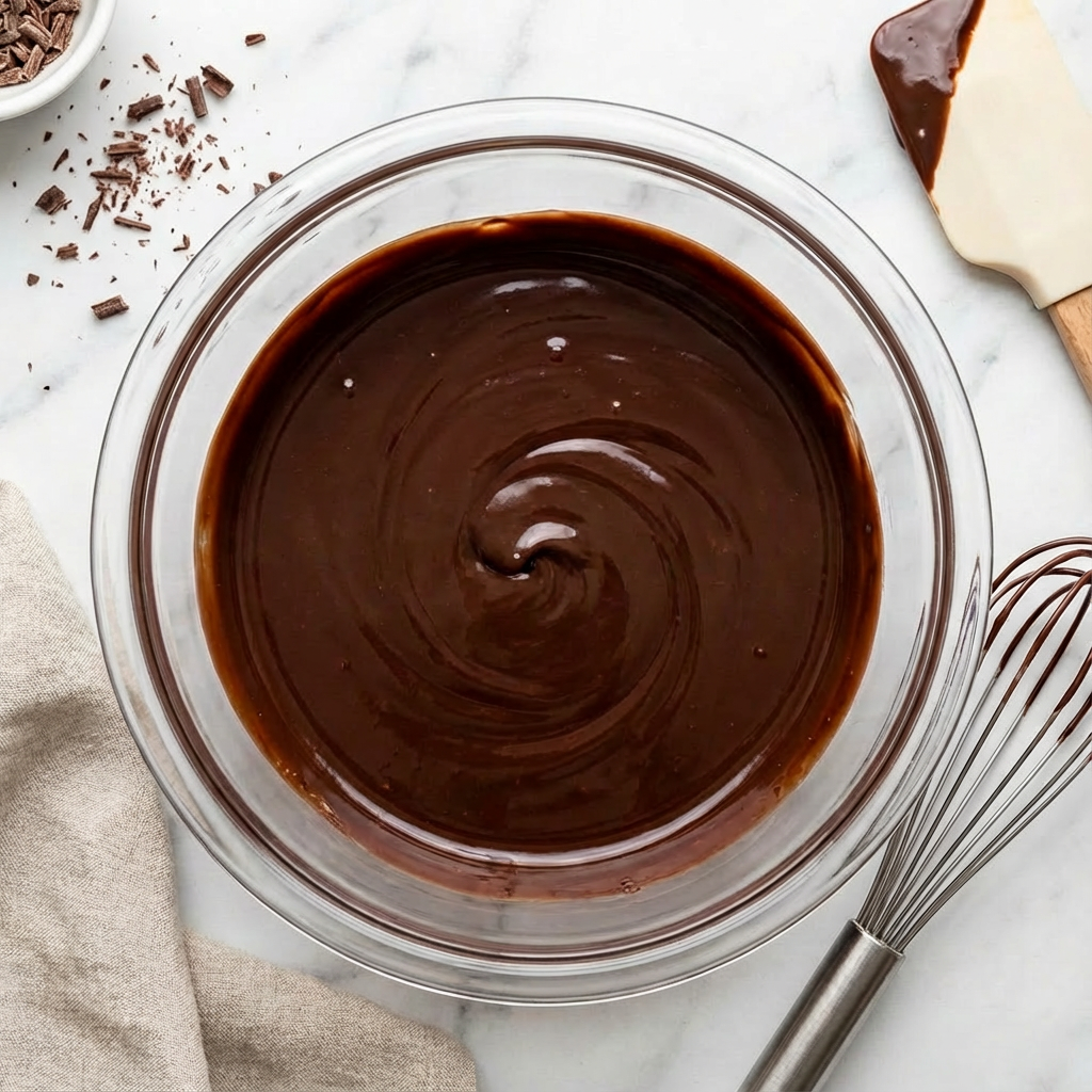 Immediately pour the hot cream over the chocolate. Let it sit undisturbed for 3 minutes to allow the chocolate to melt. Then, starting in the center, gently whisk in small circles until the mixture is completely smooth, glossy, and emulsified.
