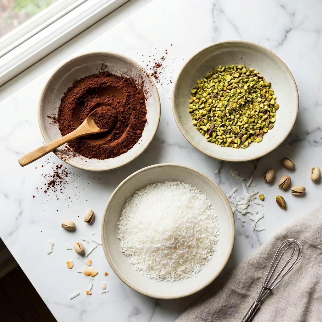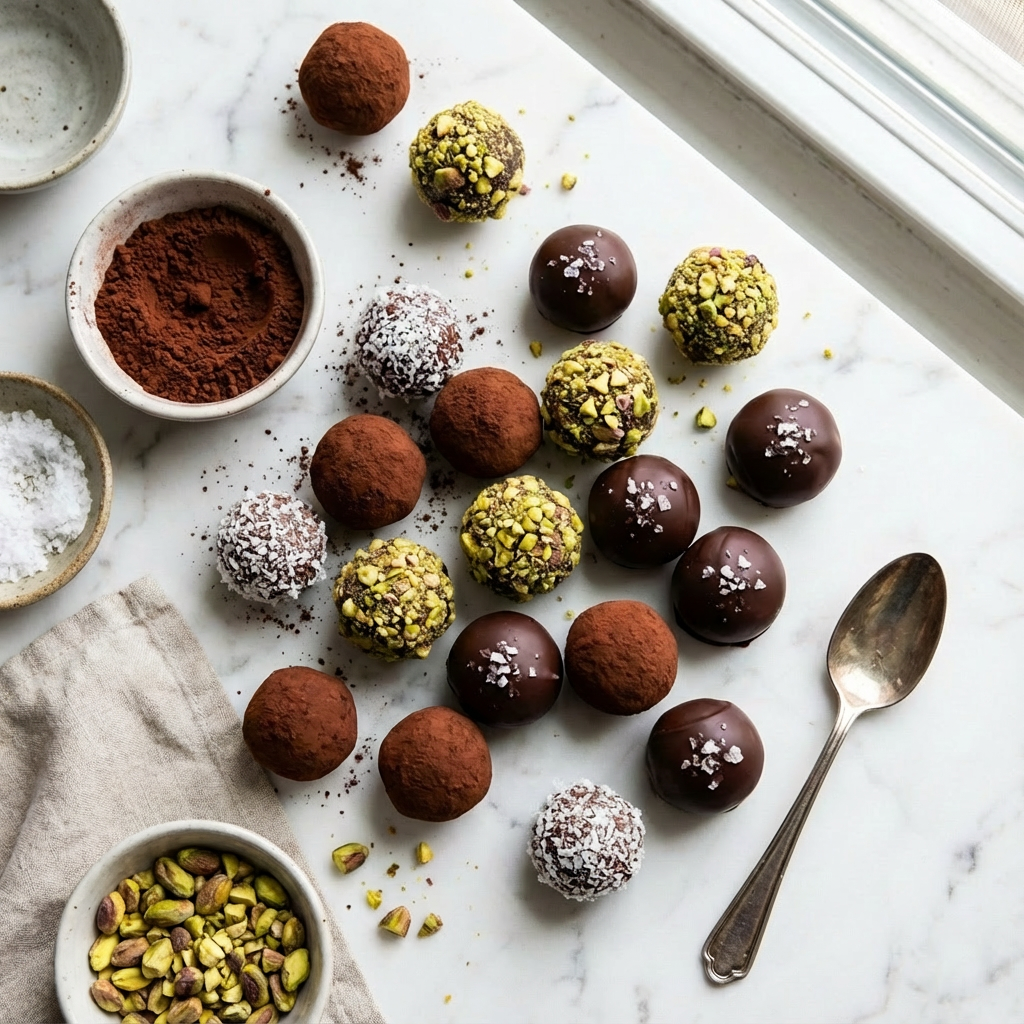 Prepare your chosen coatings in separate shallow bowls. For dry coatings (cocoa, nuts, coconut), roll each ganache ball until fully covered, then return to the parchment sheet.