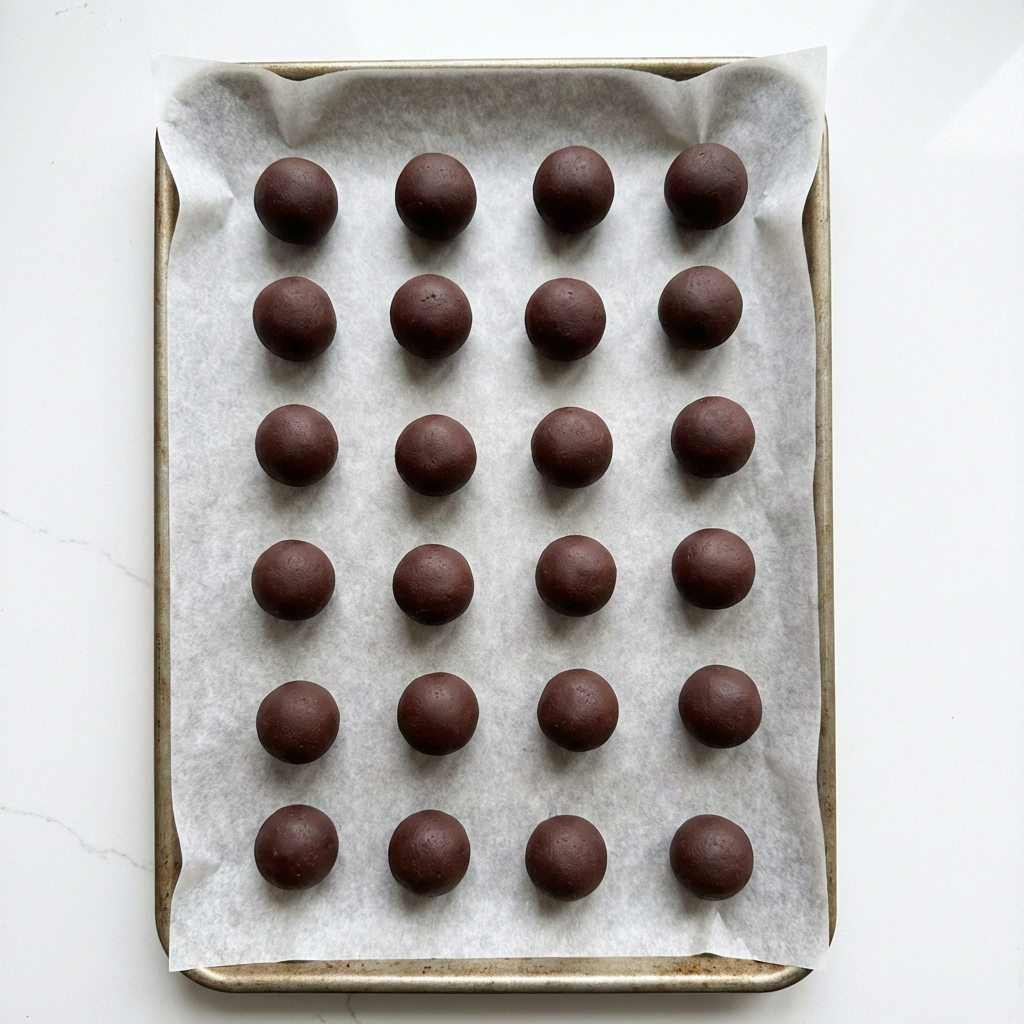 Using a small cookie scoop, melon baller, or a teaspoon, portion the firm ganache. Roll each portion quickly between your palms to form a rough, uneven ball (this gives them the classic “truffle” look).