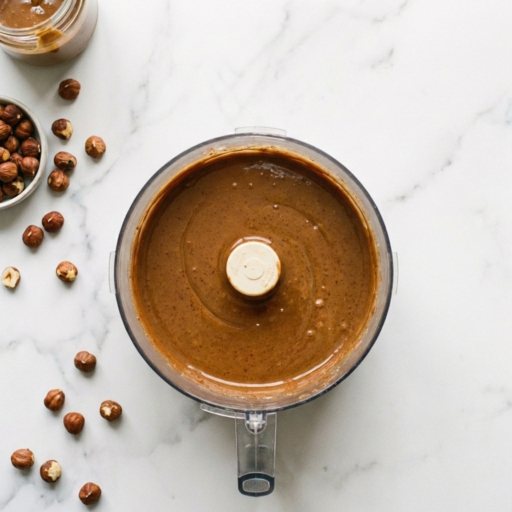 When processed in a high-powered blender or food processor, the hazelnuts break down first into a dry meal, then a thick paste, and finally release their oils to become hazelnut butter. Adding melted chocolate and a liquid sweetener (like maple syrup or honey) introduces cocoa butter and sugars, which, when blended with the nut oils, form a smooth, homogenous emulsion.