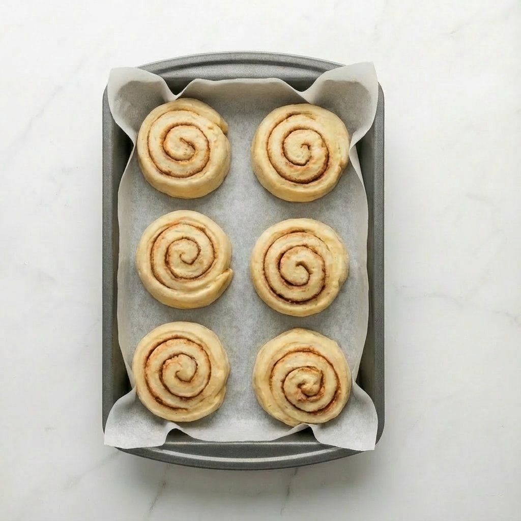 Place the swirled rolls cut-side up in a greased 9-inch round cake pan or cast-iron skillet, spacing them slightly apart. Cover and let rise until puffy and nearly doubled, about 45-60 minutes. Preheat oven to 350°F (175°C). Bake for 22-26 minutes, until golden brown on top. If the tops brown too quickly, tent with foil.
