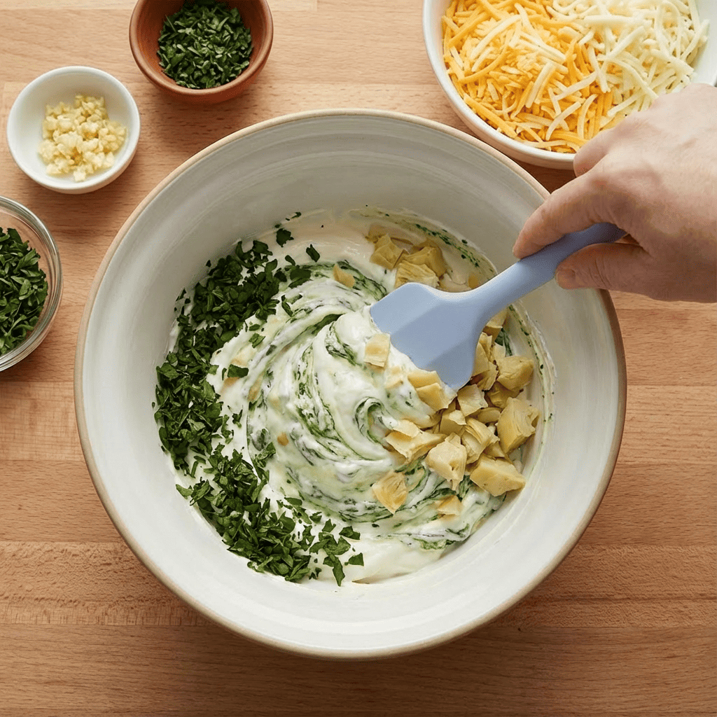 Gently fold in the bone-dry spinach and chopped artichokes until evenly distributed. The mixture will be thick.