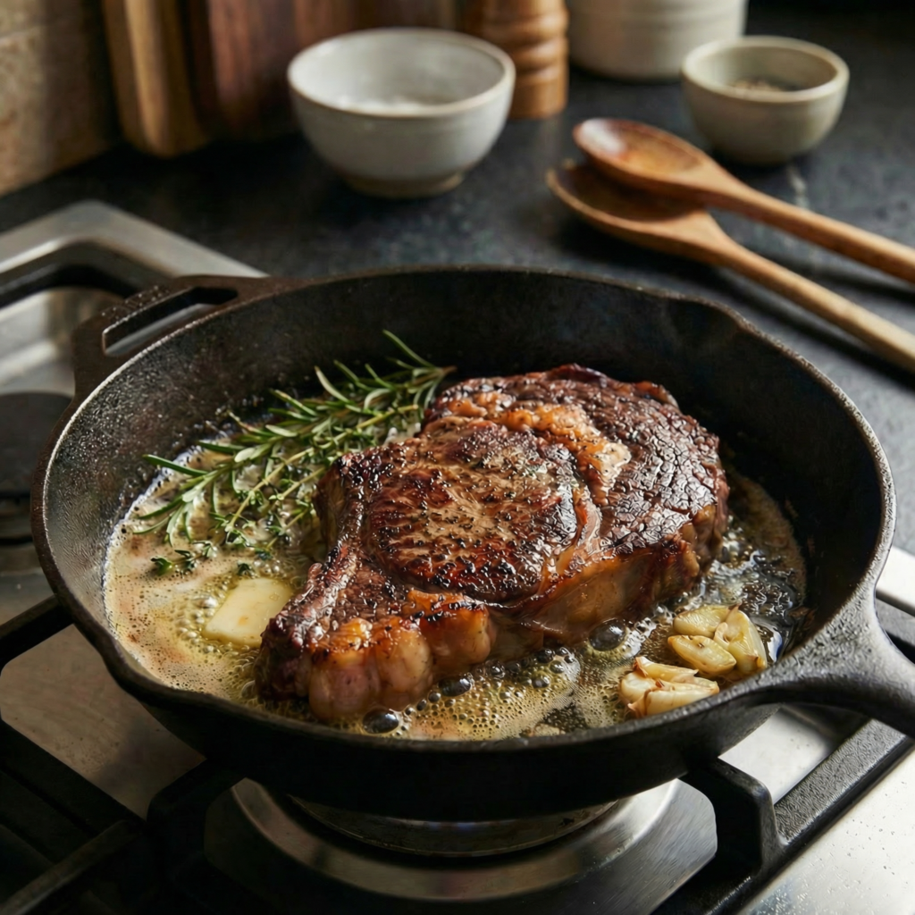 This easy ribeye steak recipe delivers a restaurant-quality steak at home with a golden crust, buttery flavor, and tender center—no grill required.
