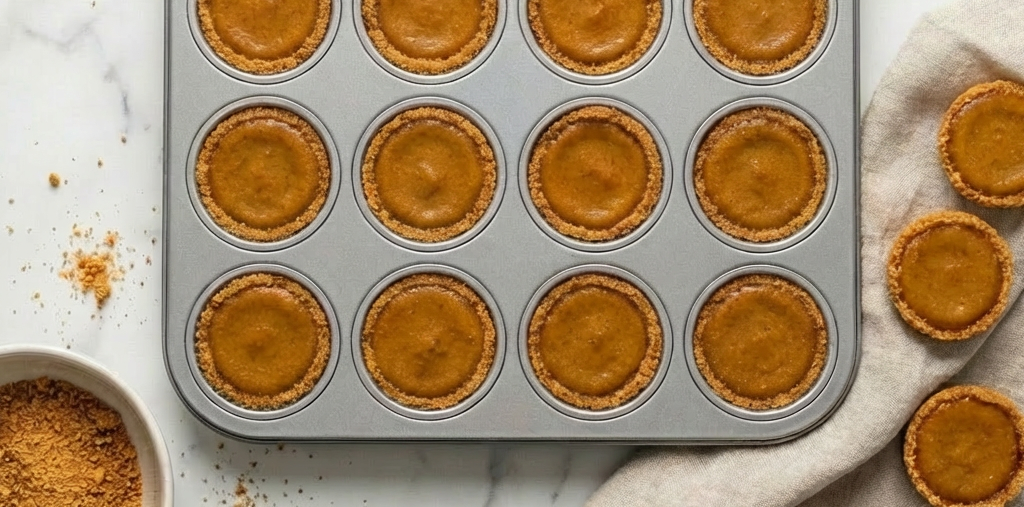 Spoon or pipe the pumpkin filling into the cooled crusts, filling each to just below the rim (about 1 heaping teaspoon each). The filling will not rise much.