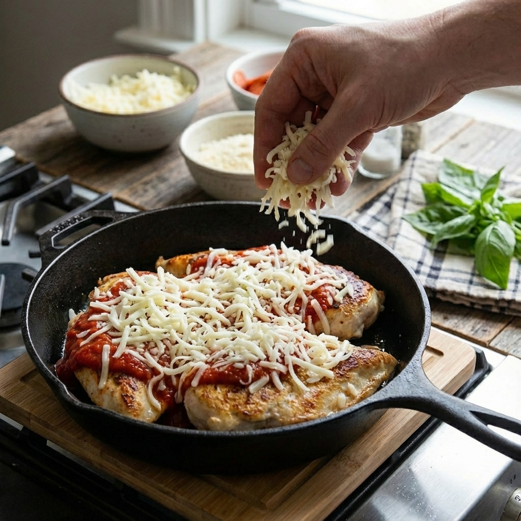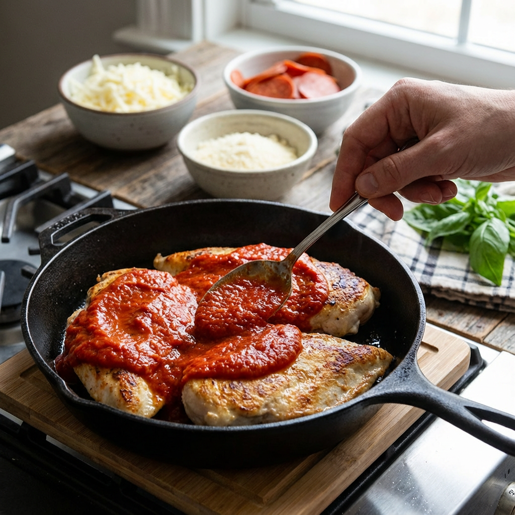 Remove the skillet from heat. Spoon the marinara sauce over each chicken breast, spreading it evenly. Sprinkle the shredded mozzarella and Parmesan cheese over the sauce, covering the chicken completely. Artfully arrange the pepperoni and any other optional toppings (olives, peppers) over the cheese.