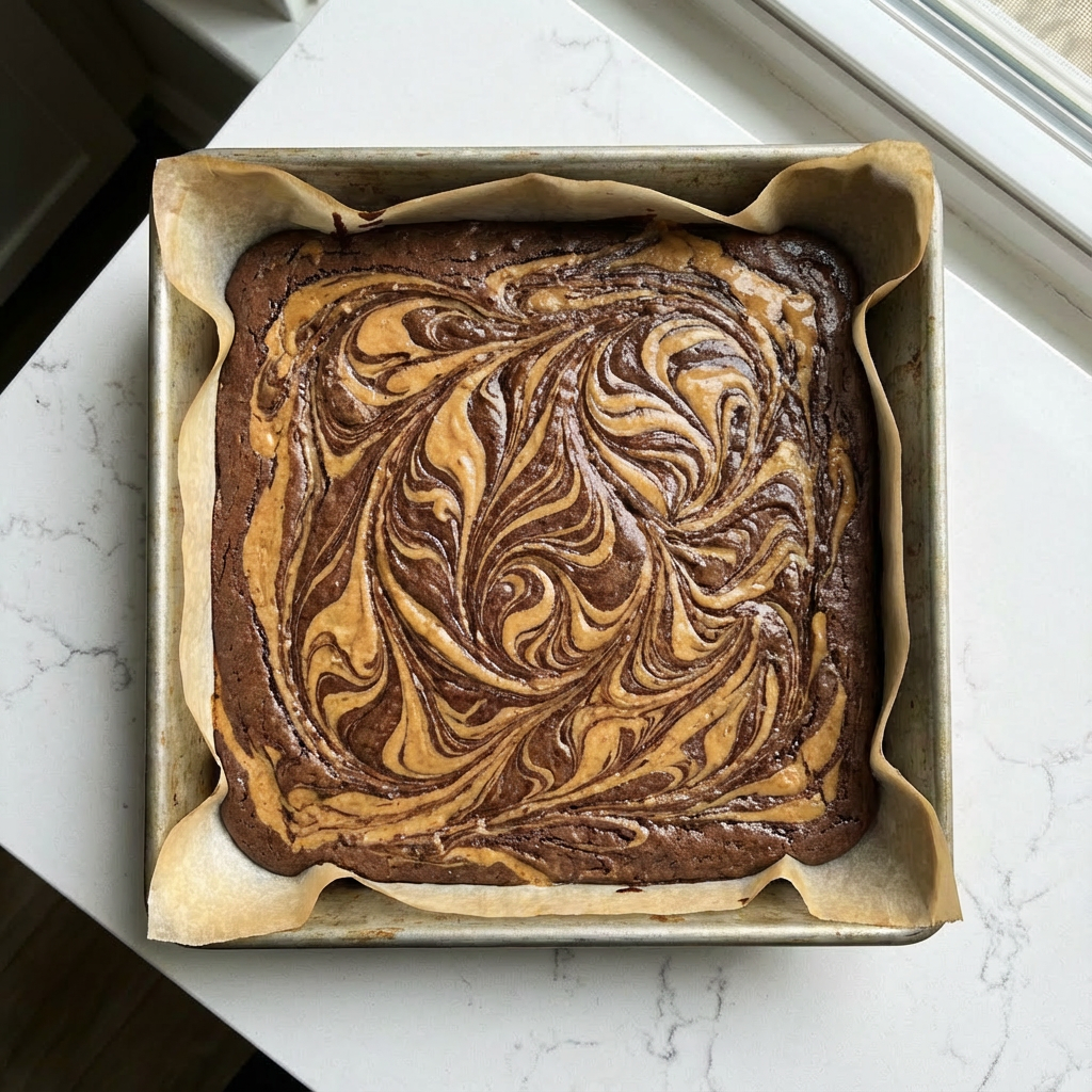 Use a knife or a skewer to gently swirl the peanut butter dollops into the brownie batter. Drag the tool in wide arcs and figure-eights to create a marbled pattern, being careful not to over-mix.