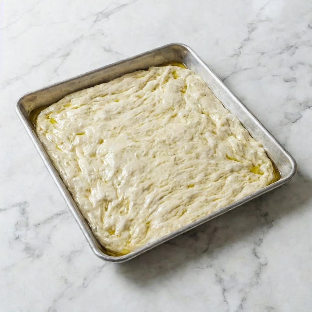The high water content (typically 65-70% hydration) yields a moist, open crumb. A 24-hour cold ferment (or at least a long room-temperature rise) allows enzymes to break down complex carbohydrates, developing deep, complex flavor and that airy interior. The generous amount of olive oil in the pan and on top of the dough ensures a crispy, golden bottom and adds richness throughout.