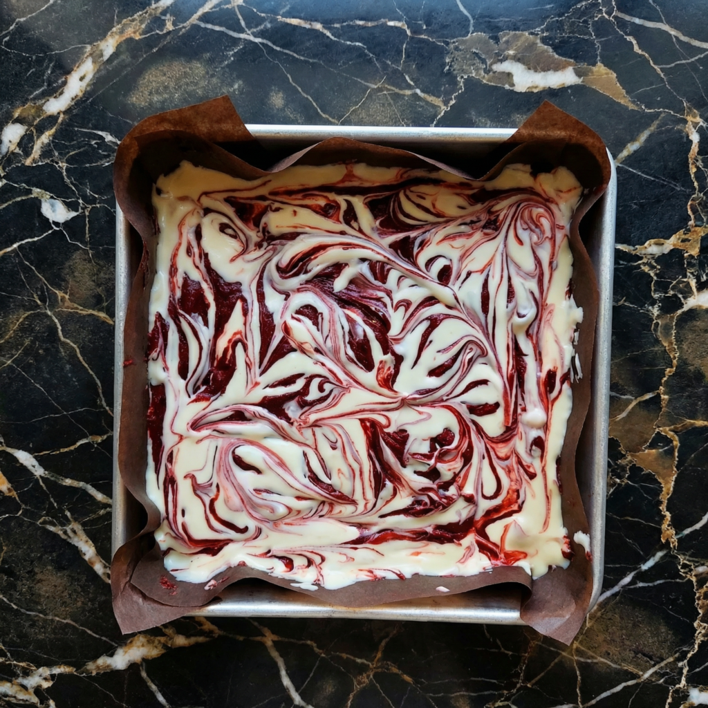 Pour the red velvet batter into the prepared pan and spread evenly. Drop spoonfuls of the cream cheese mixture over the batter. Use a knife or toothpick to gently swirl the cream cheese into the red velvet batter, creating a marbled effect. Don’t over-swirl—you want distinct pockets of cream cheese .