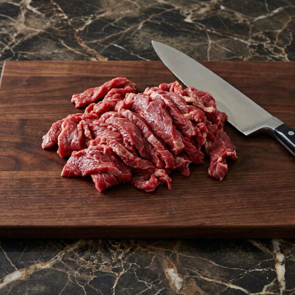For the best texture, place the ribeye steak in the freezer for about 30–40 minutes before slicing. This firms it up and makes it easier to cut into thin strips.