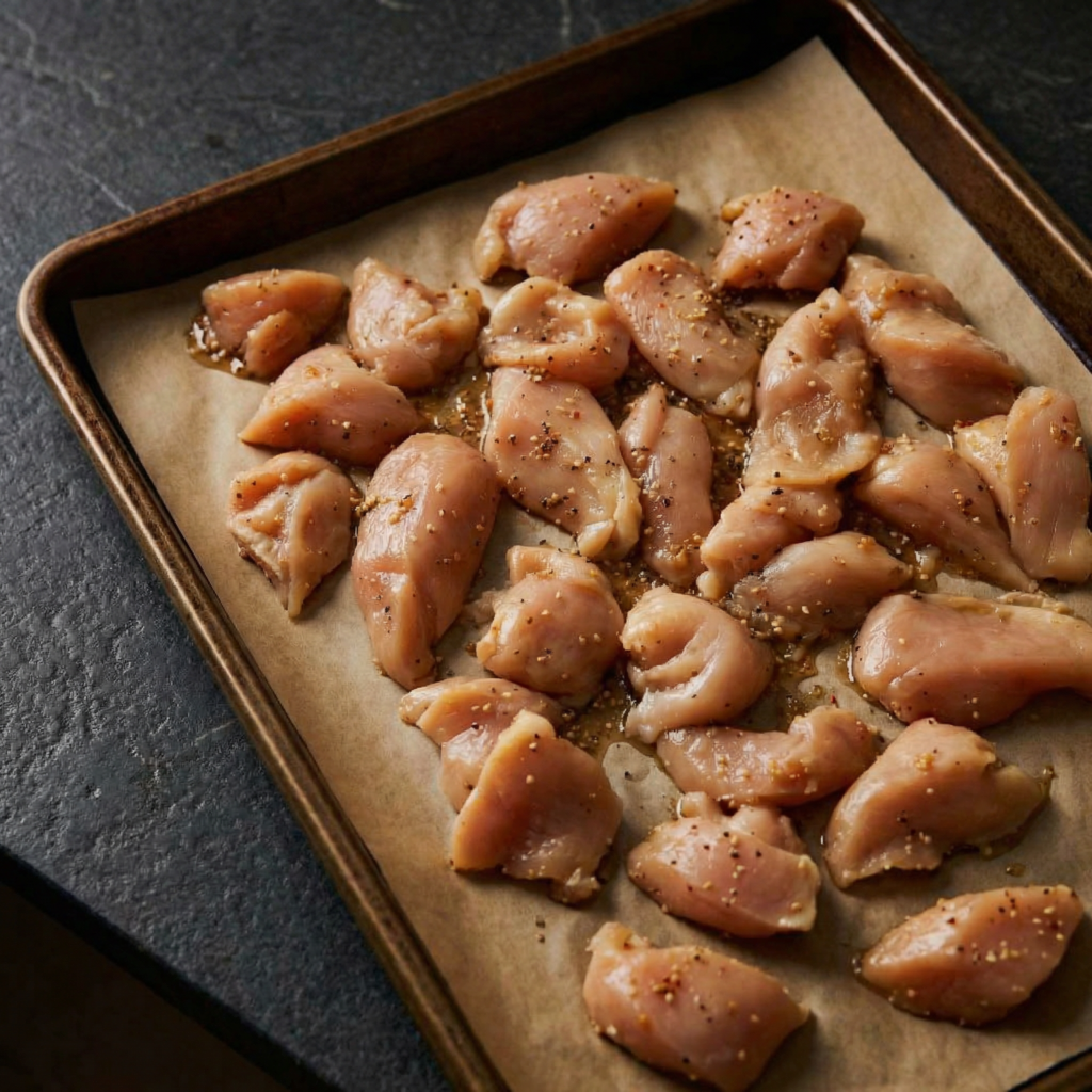 Slice the chicken into even strips, about ½ inch thick. Pat the strips dry with paper towels—this is crucial for proper browning.