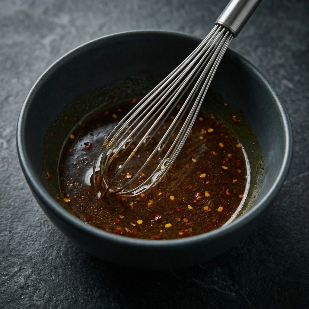 Lower the heat to medium. In the same skillet (don’t wipe it clean—the browned bits add flavor), combine soy sauce, honey, rice vinegar, grated ginger, garlic, sesame oil, and sriracha.