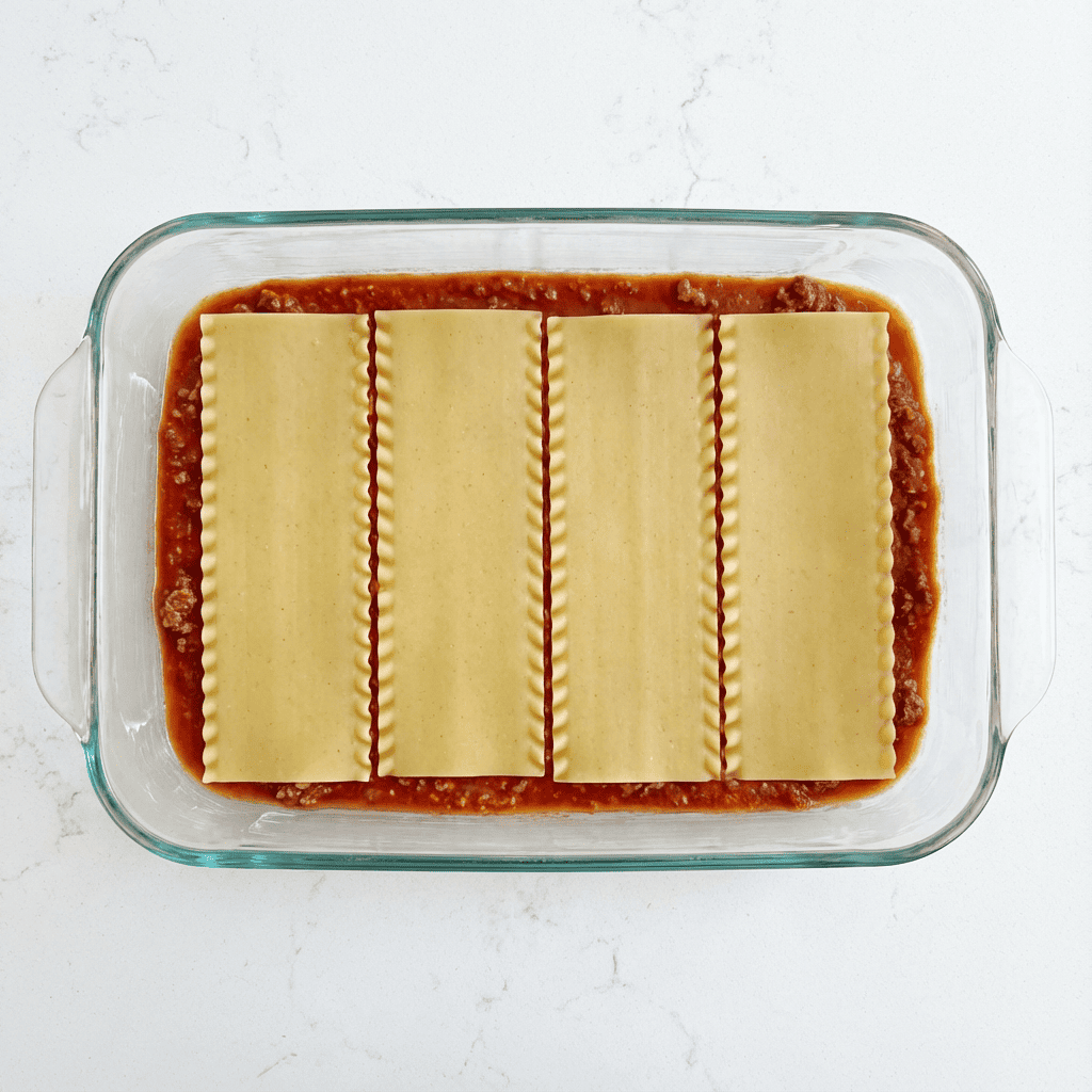 Spread 1 ½ cups of meat sauce evenly over the bottom of the dish. Arrange 4 no-boil noodles over the sauce (they will expand). Spread 1/3 of the ricotta mixture over the noodles. Sprinkle with 1 cup of shredded mozzarella. Spoon 1 ½ cups of meat sauce over the cheese. Repeat layers twice more (noodles, ricotta, mozzarella, sauce). For the final layer, top with the last 4 noodles, the remaining meat sauce, the last cup of mozzarella, and a generous sprinkle of Parmesan.
