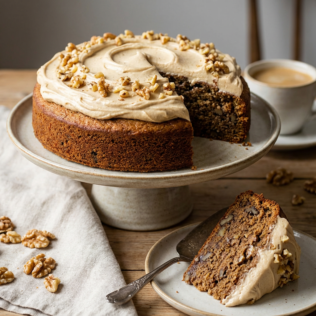 This easy, one-layer walnut cake is moist, nutty, and lightly spiced. Topped with a creamy coffee or vanilla frosting, it’s a timeless dessert perfect for any gathering.